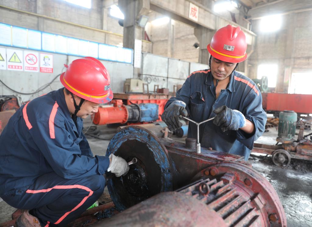 機電科職工宋佳芳和張連玉正在維修耙矸機齒箱。“多修一臺設備,就能節省一點費用,也能為礦井修舊利廢工作出把力?!眱扇藞远ǖ乇硎?。